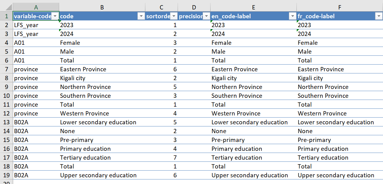 The code saves an Excel document and we can now do our translations in the different sheets. The sheet for “Cells” is shown below, where we can translate the value labels of our variables into French in the column “fr_code-label”.